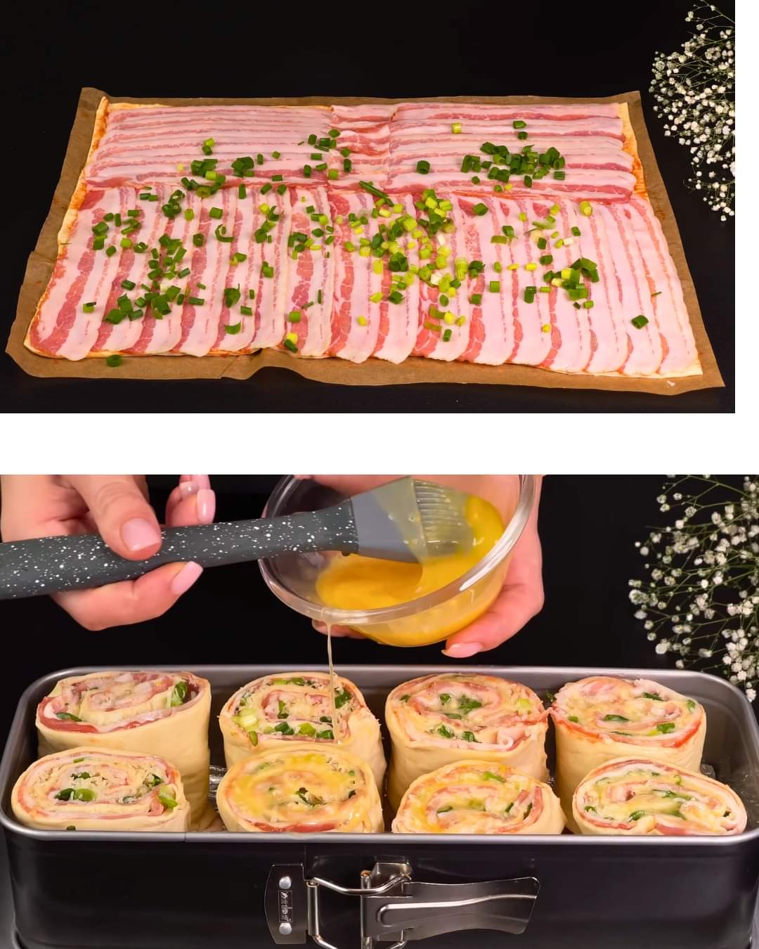 Deze bladerdeegrolletjes met spek en kaas zijn een heerlijke en makkelijk te bereiden snack of voorgerecht. Met goudbruin bladerdeeg gevuld met hartig spek, verse lente-uitjes en romige Parmezaanse kaas, zijn ze gegarandeerd een succes op elk feestje.