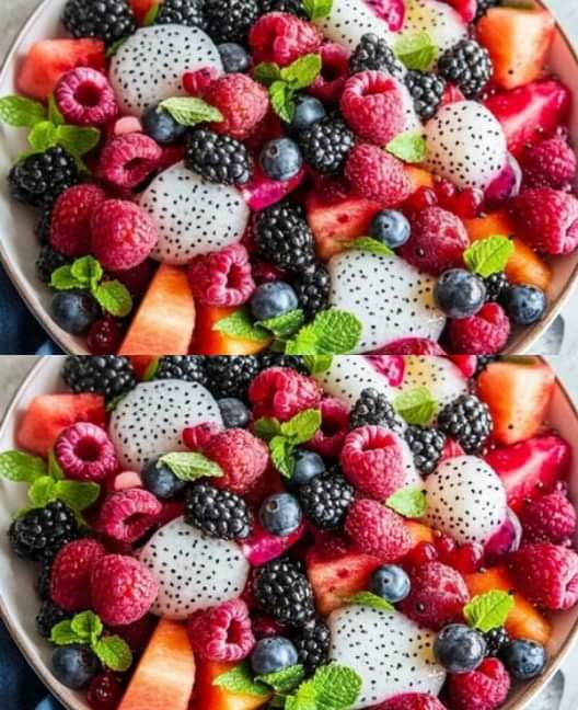 Een verfrissende en kleurrijke fruitsalade met sappige watermeloen, pittige bessen en exotische drakenvrucht, afgemaakt met een vleugje munt en maanzaad. Perfect voor een snelle en gezonde snack of een kleurrijke toevoeging aan elke maaltijd!