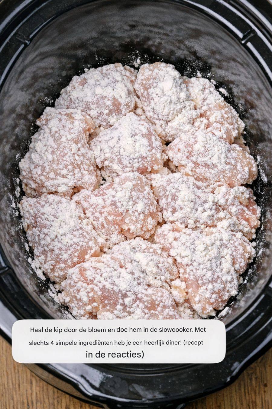 Haal de kip door de bloem en doe hem in de slowcooker. Met slechts 4 simpele ingrediënten heb je een heerlijk diner!