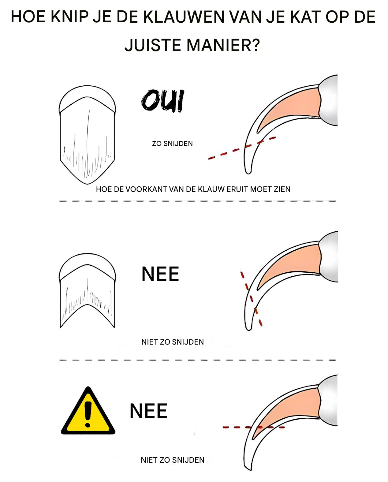 Nooit: Knip niet in het roze gedeelte, want daar bevinden zich alle bloedvaten en zenuwen.