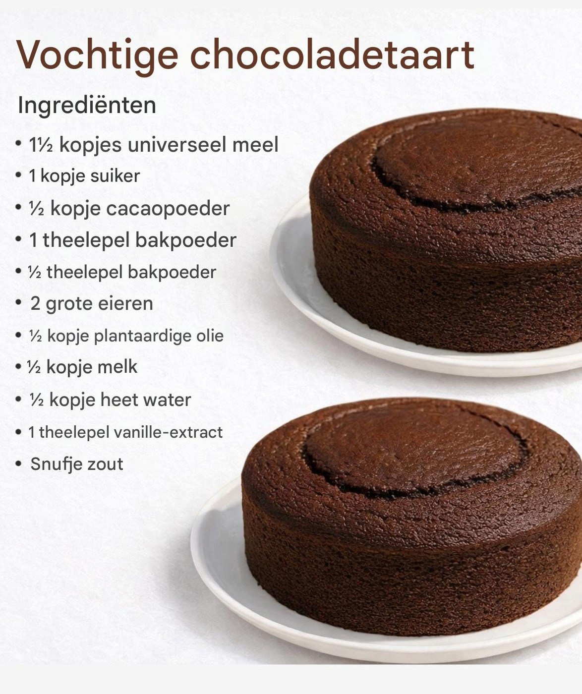 Voor een zachte en smaakvolle chocoladetaart heb je de volgende ingrediënten nodig: