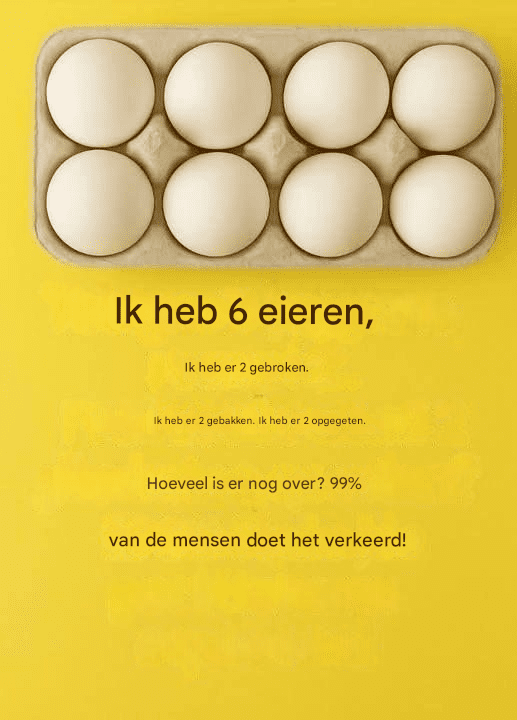 “Ik heb 6 eieren. Ik heb er 2 gebroken. Ik heb er 2 gebakken. Ik heb er 2 opgegeten. Hoeveel eieren heb ik nog over?”