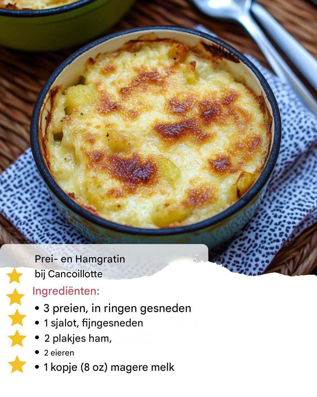 Een smeltende en heerlijke gratin, licht maar supercomfortabel, ideaal voor een avondmaaltijd! Ingrediënten (Amerikaanse maten)3 preien, in ringen gesneden1 sjalot, fijngehakt2 plakjes ham, in stukjes gesneden2 eieren1 kopje (225 gram) magere melk1 el maïzena½ kopje (115 gram) cancoillotte (gesmolten kaas)⅓ kopje (55 gram) geraspte kaas (Gruyère, Comté, Parmezaanse kaas, enz.)Zout, peper naar smaak1 el olijfolie Bereiding: