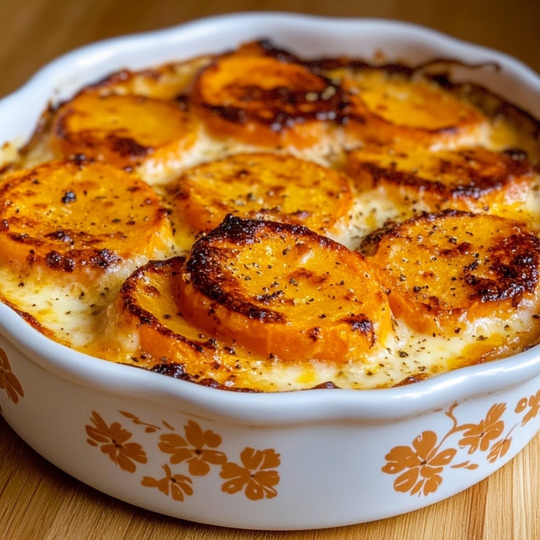 Romige en goudbruine zoete aardappelgratin