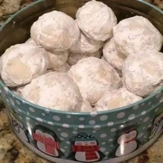 Ingrediënten: 1 kopje ongezouten boter 5 eetlepels pure suiker 2 theelepels vanille-extract 1/4 theelepel fijnkorrelig zout 2 kopjes bloem 2 kopjes gehakte walnoten, amandelen of pecannoten 1 1/2 kopjes poedersuiker Meng de zachte boter met de poedersuiker. Voeg de vanille toe. Voorbereiding: LEES VERDER OP DE VOLGENDE PAGINA 🥰