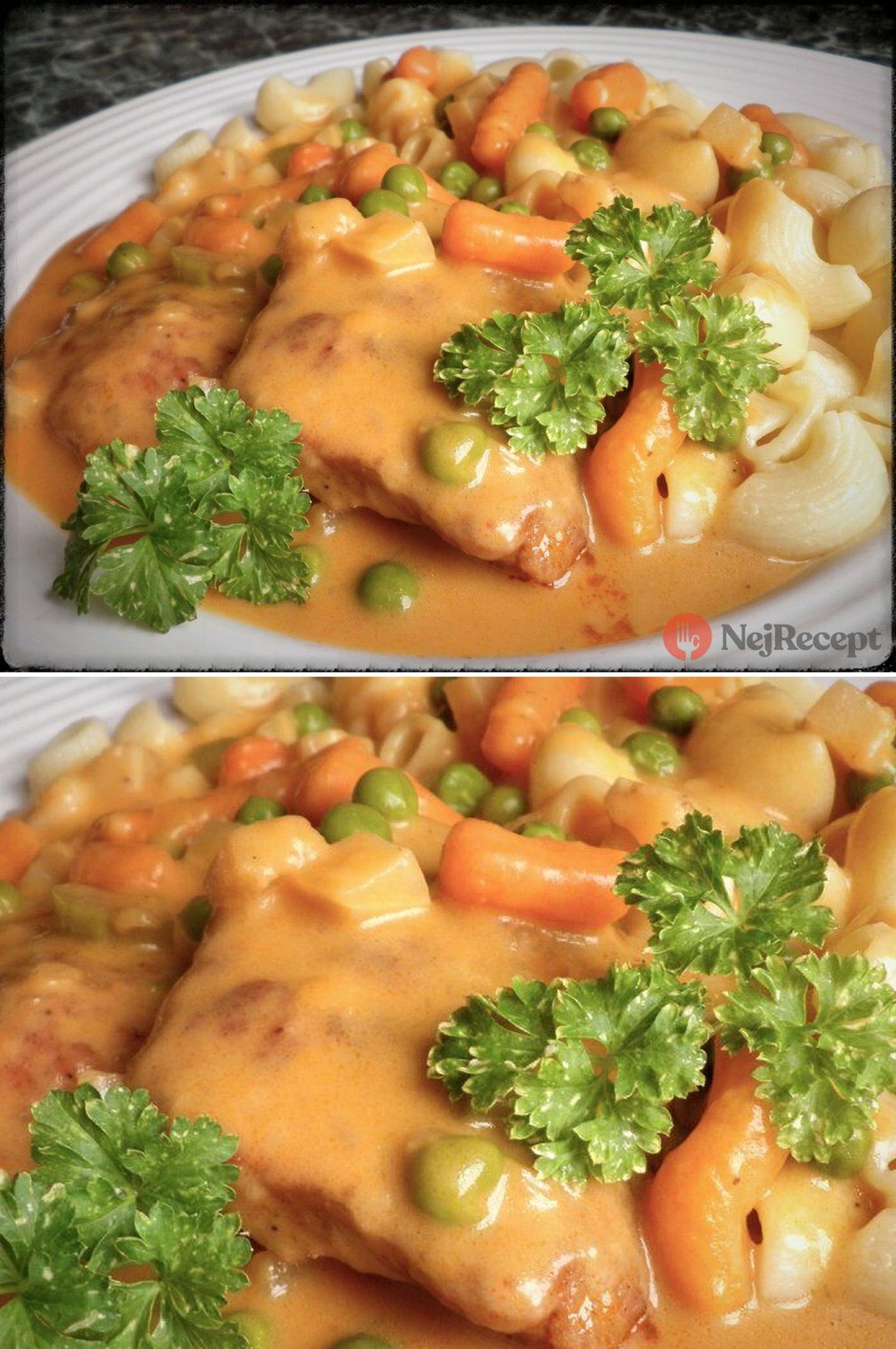 Gestoofd varkensvlees met erwten-wortelsaus en noedels